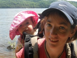Before having the baby I had visions of taking her on day hikes in a backpack especially to one of my favorite parks, Afton State Park, which incidentally is only a stone’s throw across the river from where LC was born.Today, my roommate Zhanglin and I took the baby for a hike. We hiked about 3 miles total, went for a swim in the St. Croix, and had a nice picnic lunch in the sand. It was a hot day and the up and downs of Afton made for a good work out. LC LOVED the water and had a great time swimming. She also enjoyed her first strawberry.