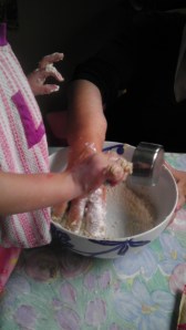 1. First we added the flour into the bowl. She liked to shift her fingers through the flour.