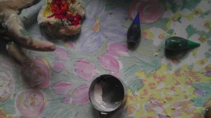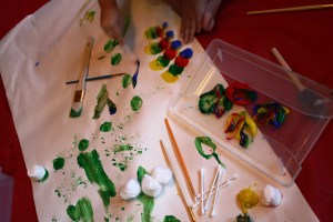 It was time to cook dinner and I needed an activity for my three year old and an adult friend I had over. Fingerpaints, I thought! It was something I’d been wanting to do but hadn’t had the time to explore fully. I pulled out the easel paper, a thin waterproof drop cloth that I keep on hand for messy occasions (I think I picked it up at the dollar store or a local drugstore. It was cheap but seemed like it might come in handy some day), and the paints.