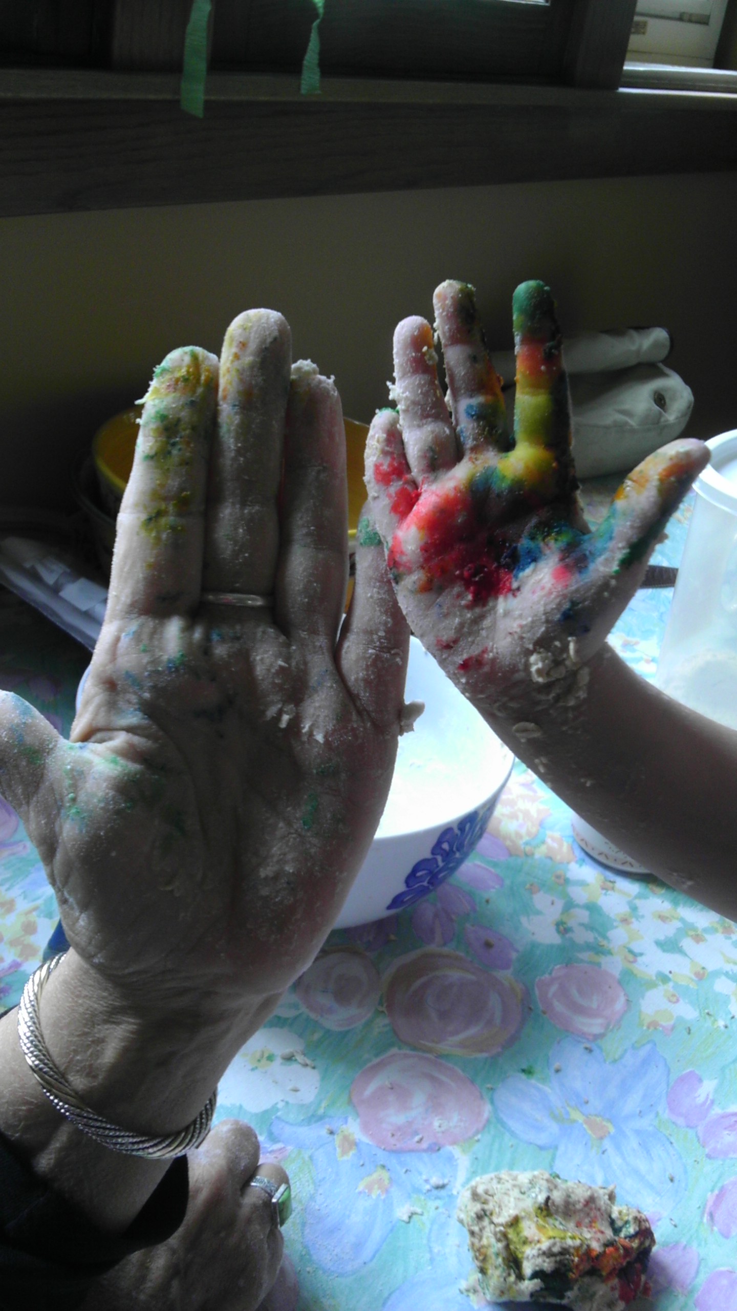 2. Then I added the water. She wasn’t a fan of the sticky feel of this so grandma helped out.