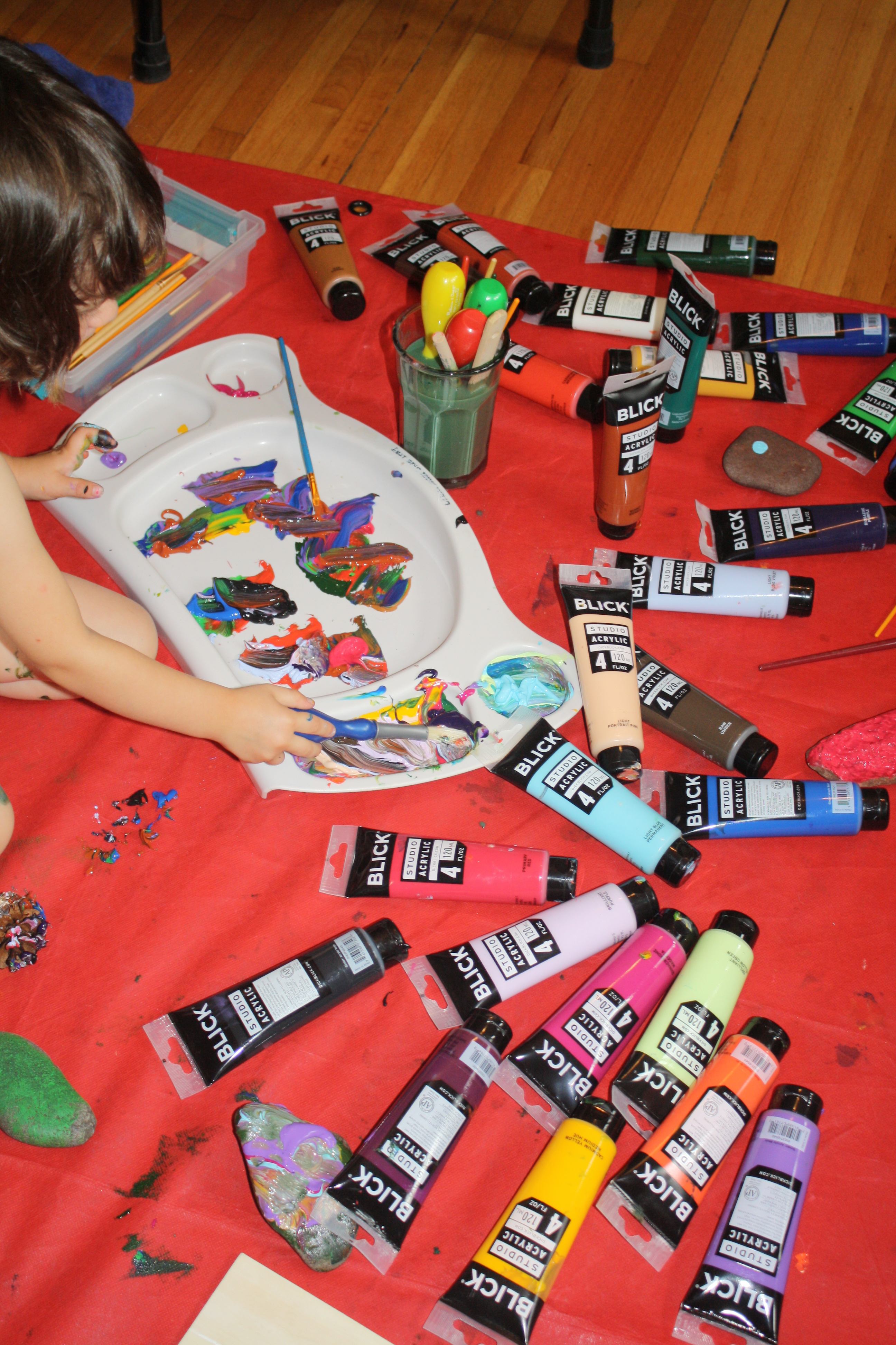 At home we pulled out the acrylic paints and brushes. I used a highchair tray as the palette.